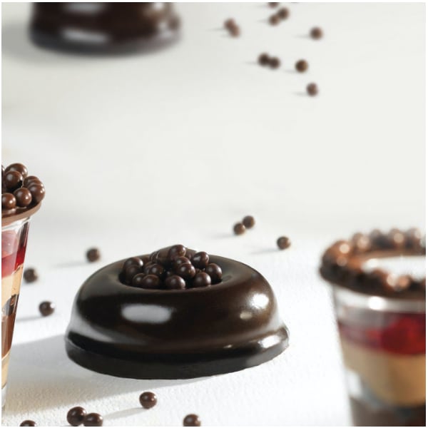 Perle mici strălucitoare din ciocolată neagră, cu miez de biscuiți crocanți. Conțin 84% ciocolată, minim 50.4% cacao și au un diametru de 3-4 mm.